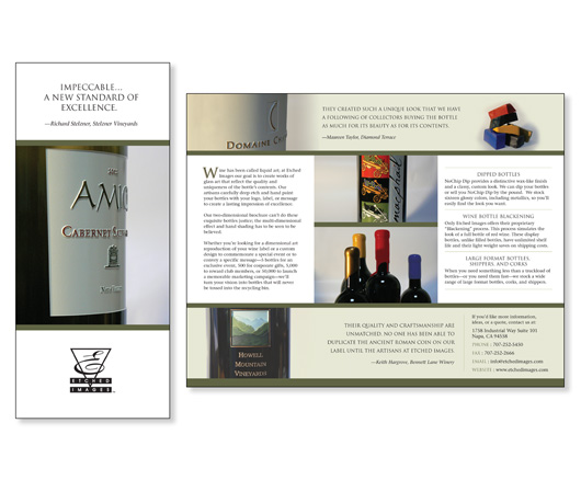 This 6-panel brochure for Etched Images is printed on a cream smooth matte finished paper and has spot varnish on top of the beautiful photography.
