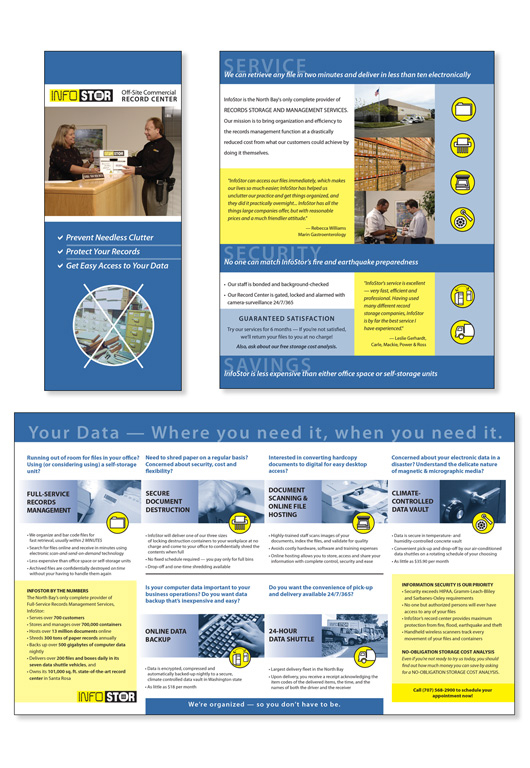 This is an 8-panel brochure for InfoStor, a records storage and management service in Santa Rosa, CA.