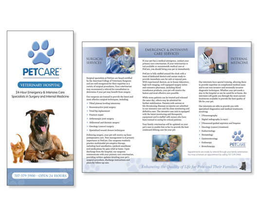 Here is a 6-panel capabilites brochure designed for Petcare Veterinary Hospital.